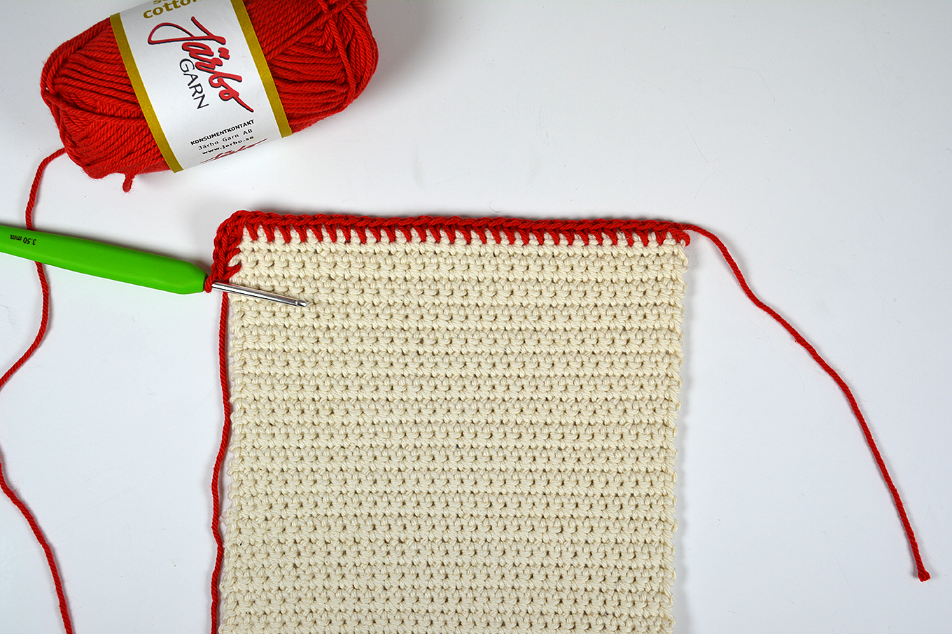 Här har jag inte tagit av garnet på den röda rutan, då kan jag bara fortsätta virka kanten med den öglan (se nedan).