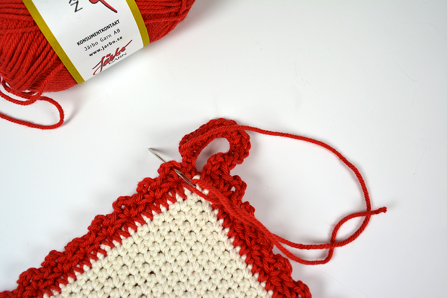 När du kommit runt till början gör du 3 fasta maskor i sista hörnet.