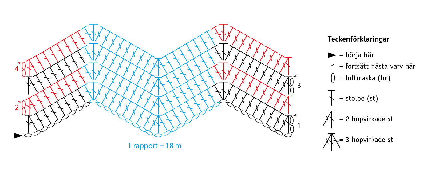 Tips: För att virka runt, på t.ex. en kjol eller ett linne, virka endast hela rapporter, dvs. X * 18 lm (blåmarkerat i diagrammet), som tas ihop till en ring med 1 sm. För att undvika hål: Börja varje varv med 2 lm (vilka INTE ersätter 1:a st utan fyller ut), virka sedan 1:a st i samma lm/st som sm och sluta varje varv med 1 sm i 1:a st (inte i 2:a lm).